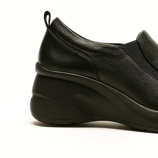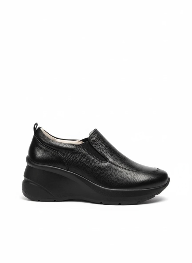 کفش چرمی زنانه لژدار مشکی، طراحی ارگونومیک با چرم طبیعی گاوی و کفی ارتوپدی. مناسب استفاده روزمره، محل کار و استایل مینیمال لوکس. ترکیب راحتی، کیفیت و ظرافت در هر قدم.